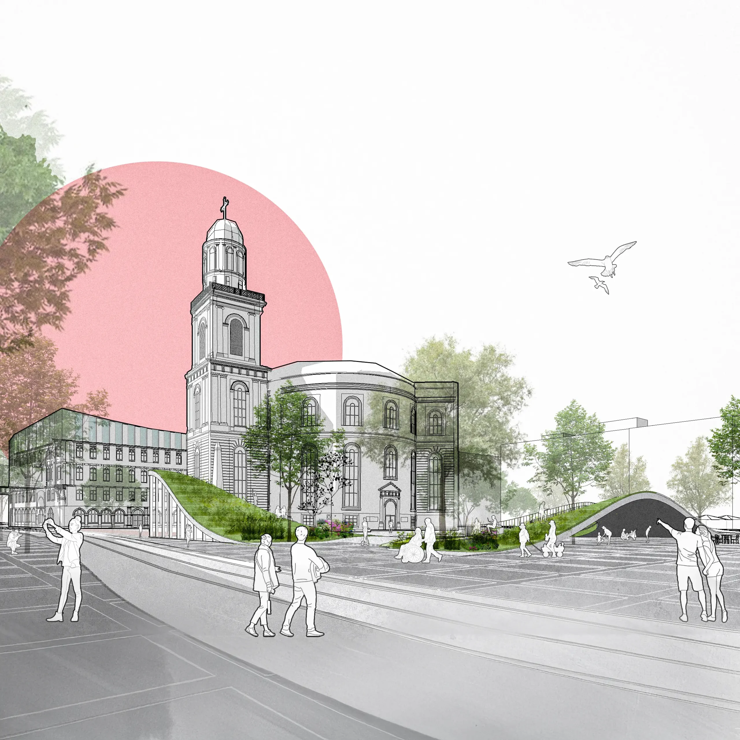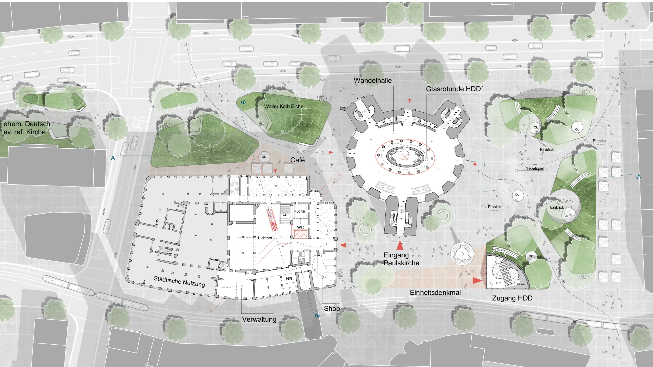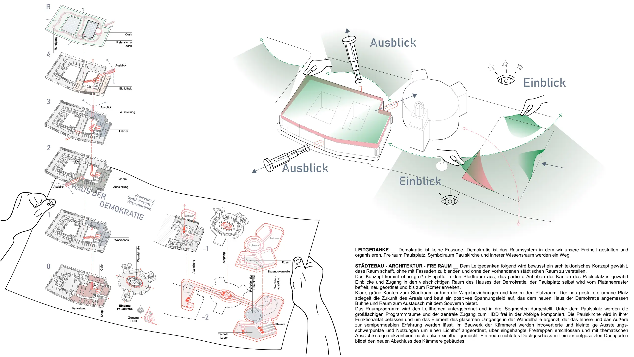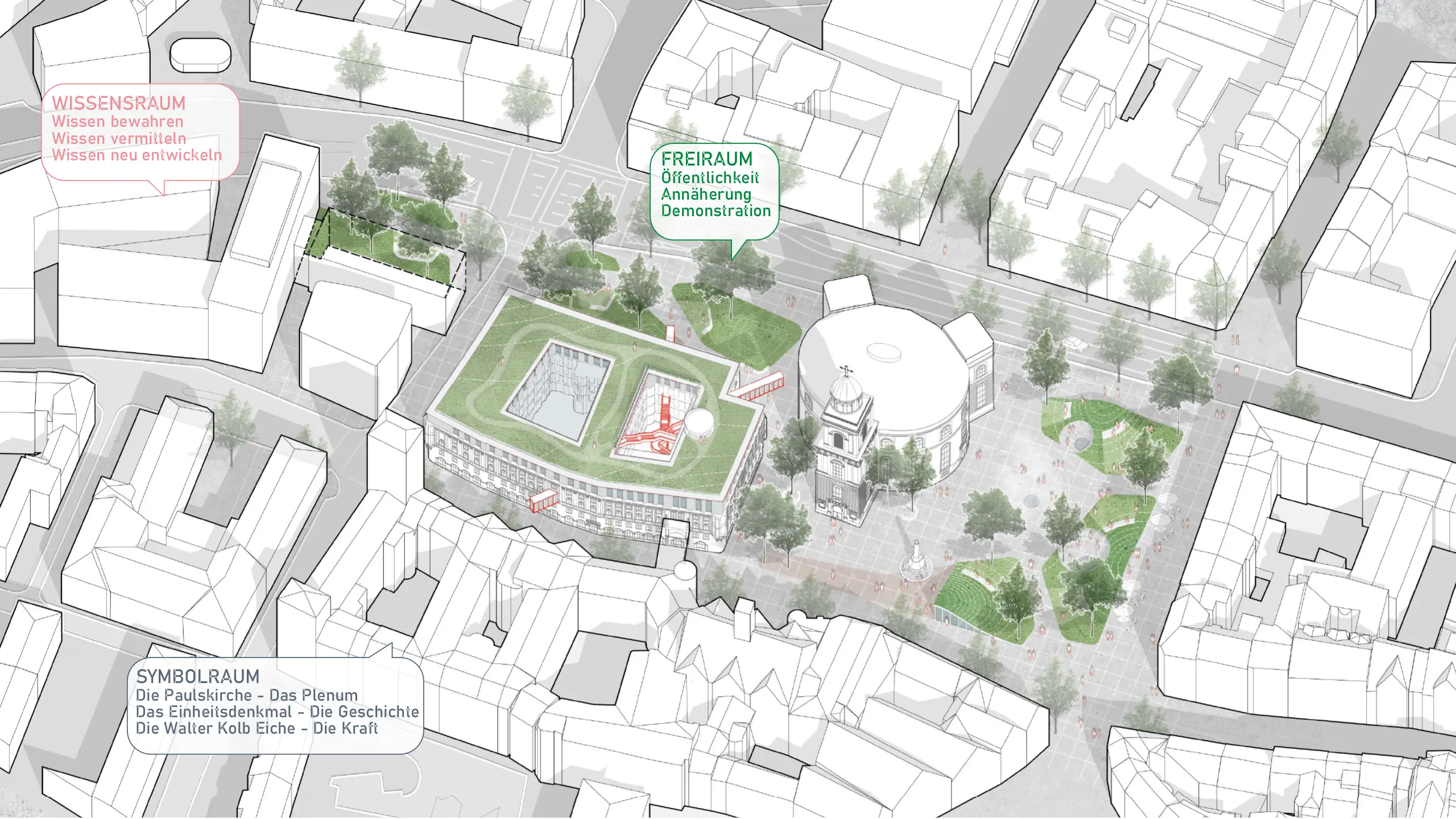 Mit wenigen Eingriffen entsteht Raum, ohne zu verstellen: Angehobene Platzränder öffnen Einblicke unter den Paulsplatz, klare grüne Kanten strukturieren Wege; die Paulskirche erhält einen gläsernen Umgang in der Wandelhalle; die Kämmerei wird um einen Lichthof mit offenen Lern-, Arbeits- und Ausstellungsformaten erweitert – gekrönt von einem Dachgarten.