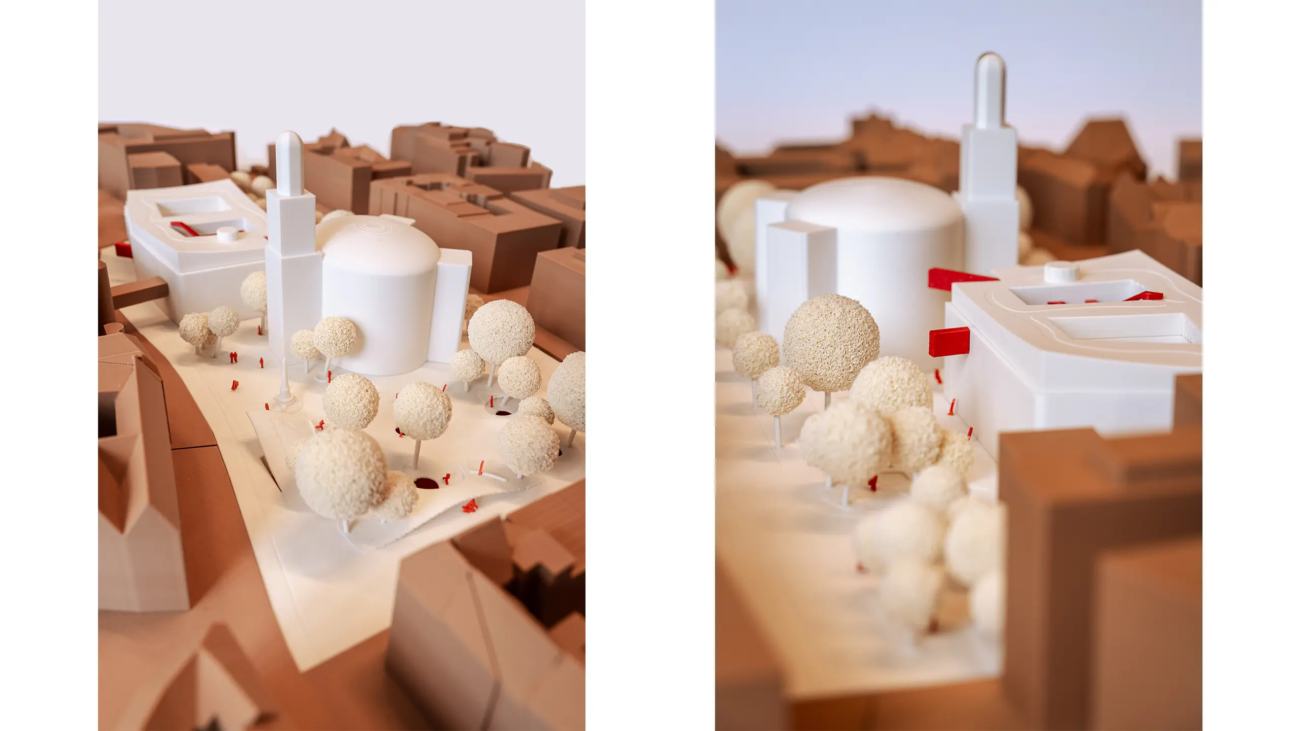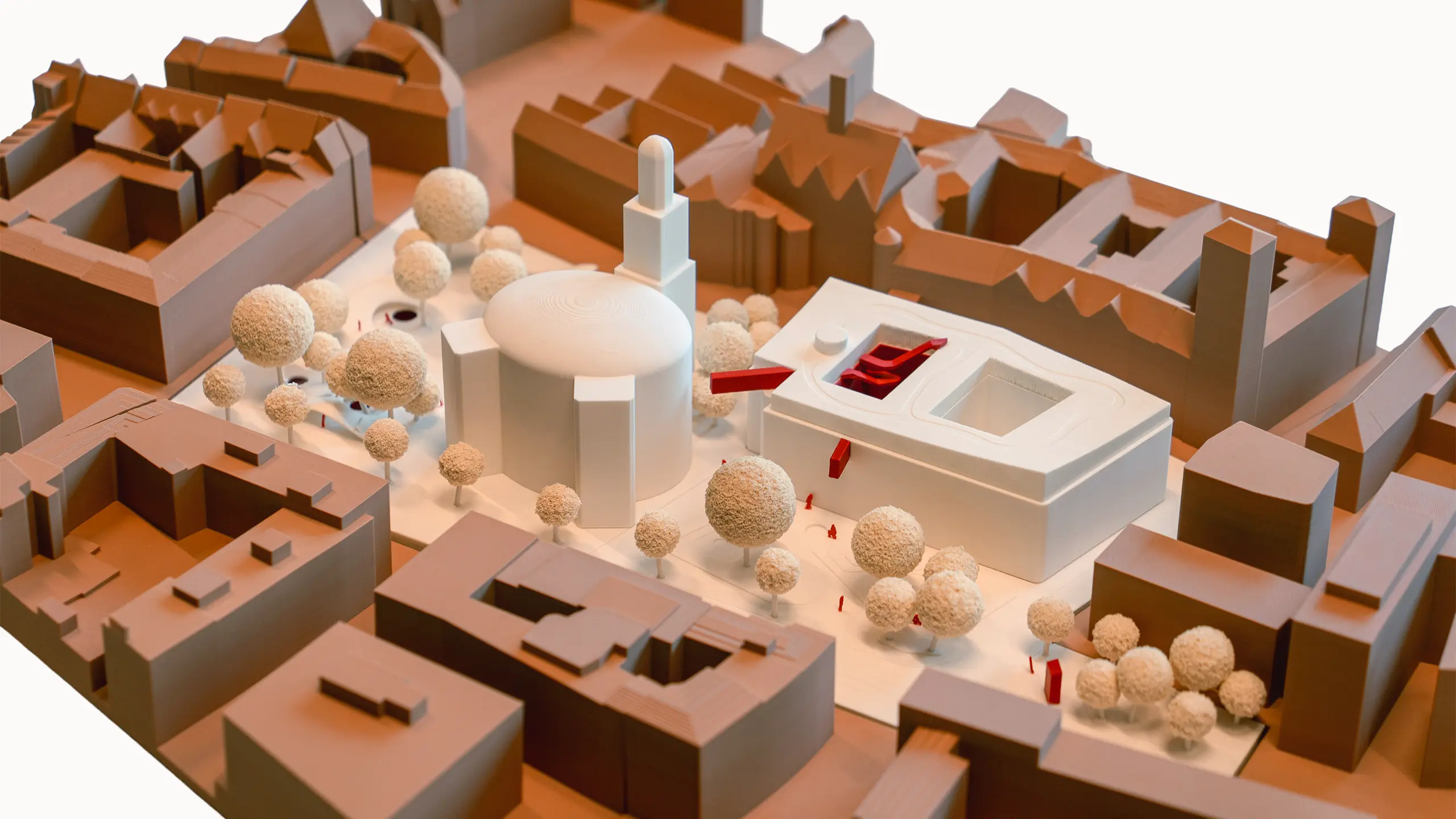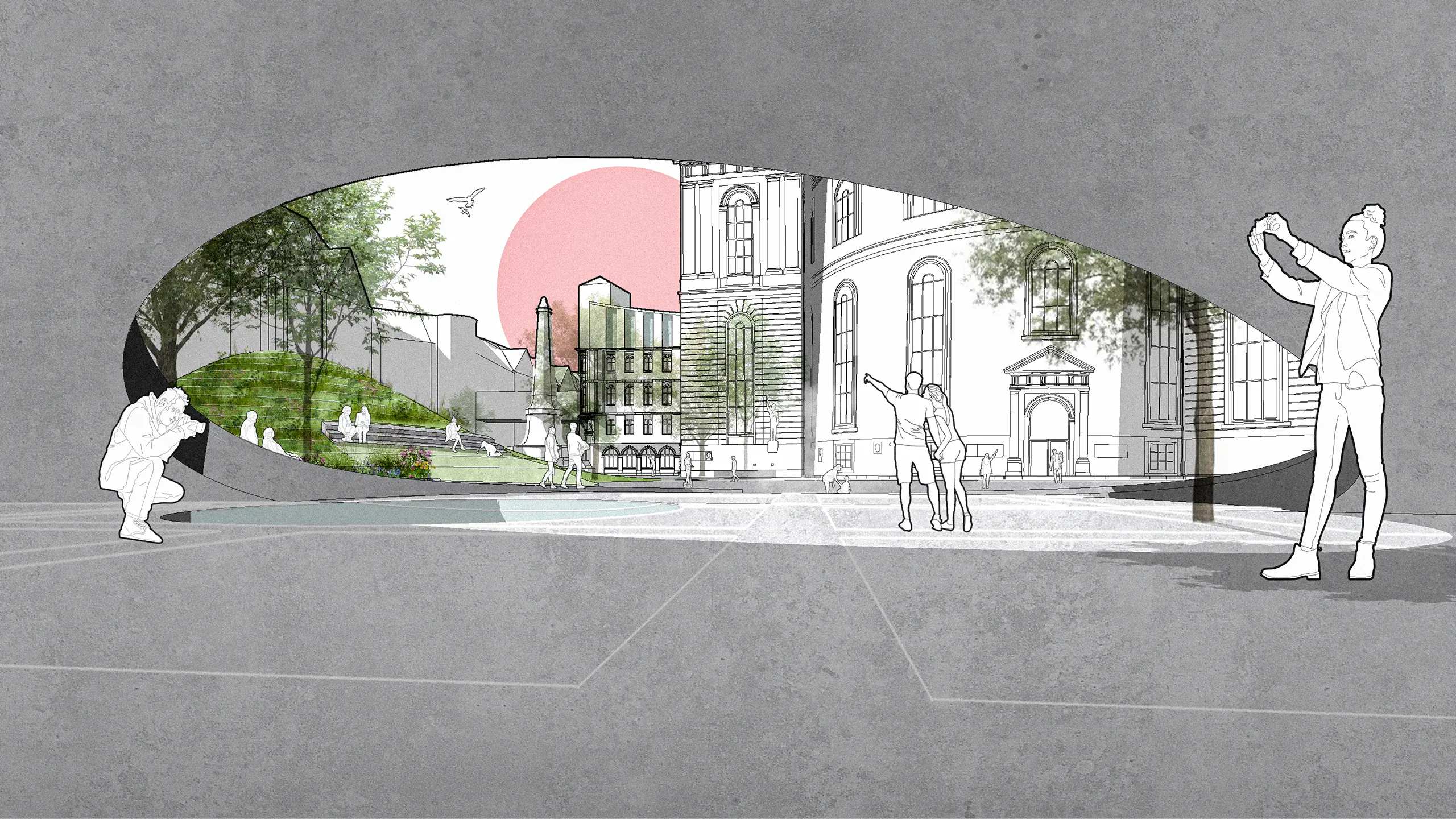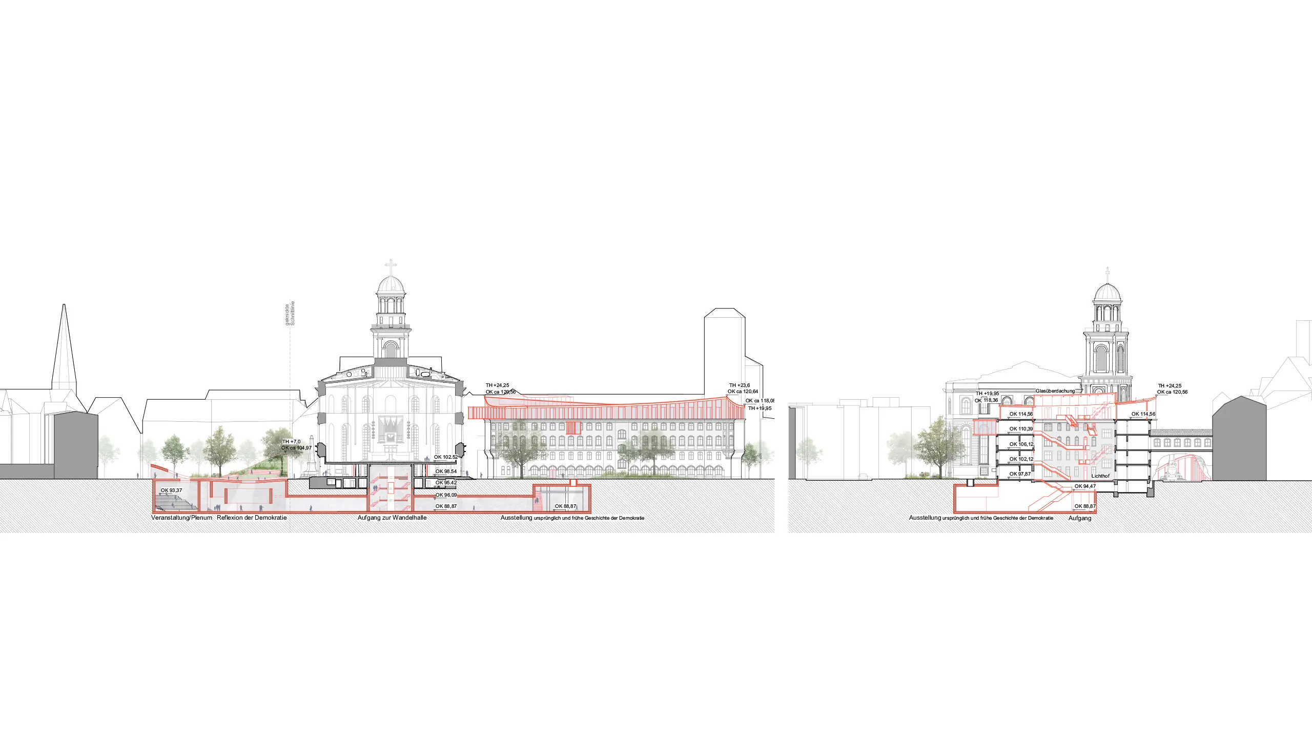 Mit wenigen Eingriffen entsteht Raum, ohne zu verstellen: Angehobene Platzränder öffnen Einblicke unter den Paulsplatz, klare grüne Kanten strukturieren Wege; die Paulskirche erhält einen gläsernen Umgang in der Wandelhalle; die Kämmerei wird um einen Lichthof mit offenen Lern-, Arbeits- und Ausstellungsformaten erweitert – gekrönt von einem Dachgarten.