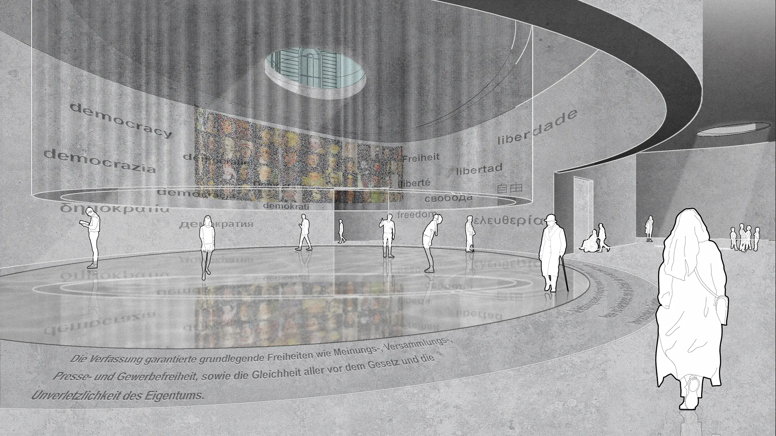 Die Installation „Stimmen der Freiheit“ inszeniert Demokratie als lebendigen Austausch: eine schwebende Rotunde mit Projektionen, Zitaten, Klang und einem Oberlicht, das Wasser und Tageslicht als bewegte Reflexion in den Raum holt.